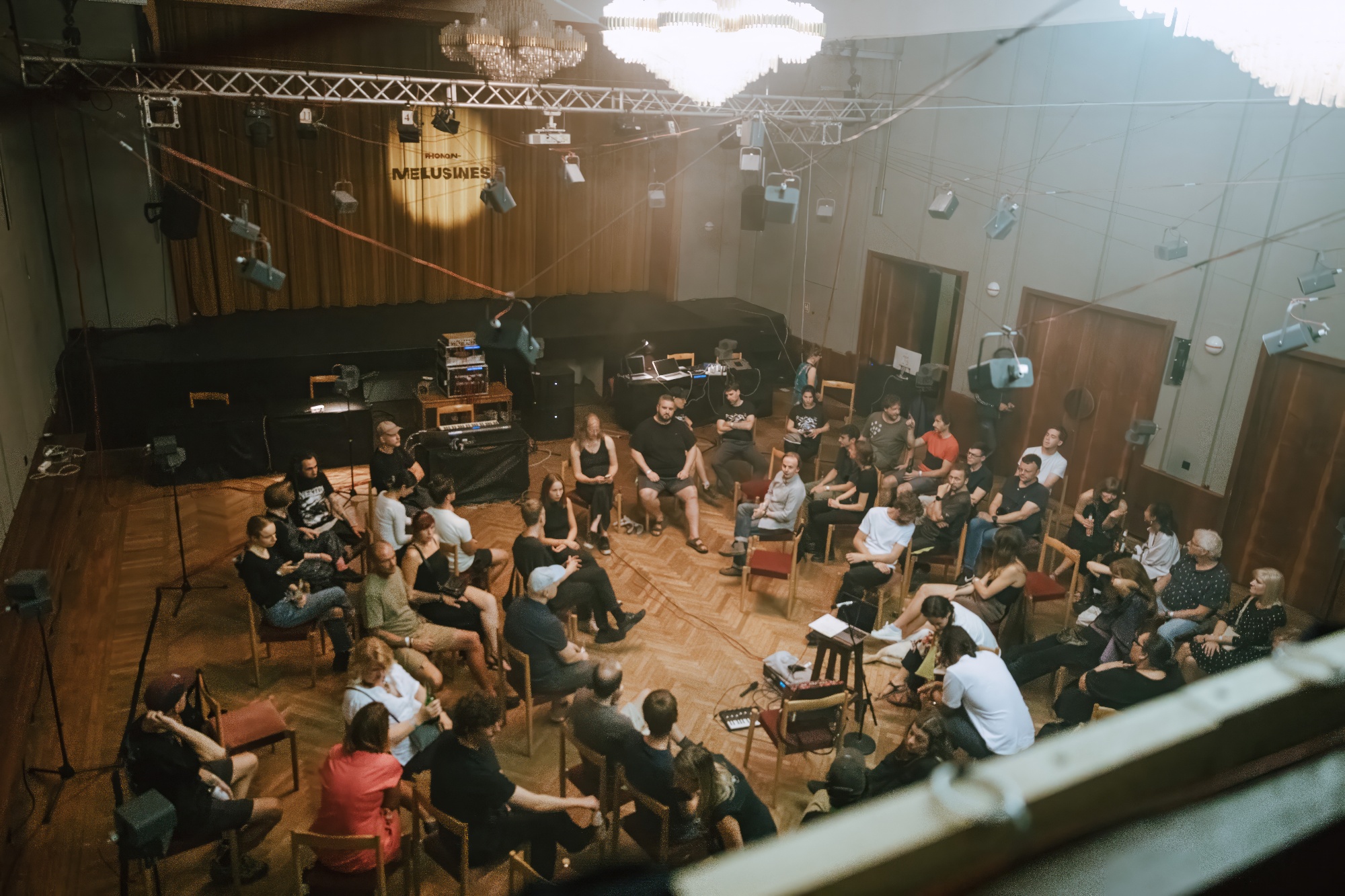 Alongside the residency ran a public symposium with workshops by artists, engineers, and philosophers, bridging practice and reflection. The final concert MELUSINES transformed the National House in Ústí into an immersive listening architecture — a moment where the audience could experience the energy of this collective process. In 2023 the lab hosted contributions from Manu Mitterhuber (OTTOsonics) on immersive system operation, Felix Deufel (ZiMMT) on multichannel recording and spatial performance tools, Enrique Tomás (Tangible Music Lab, Linz) on haptic interfaces, Jiří Suchánek (SVITAVA) on light-controlled sound, and philosophers Martin Nitsche and Vít Pokorný on phenomenology and rhythm.